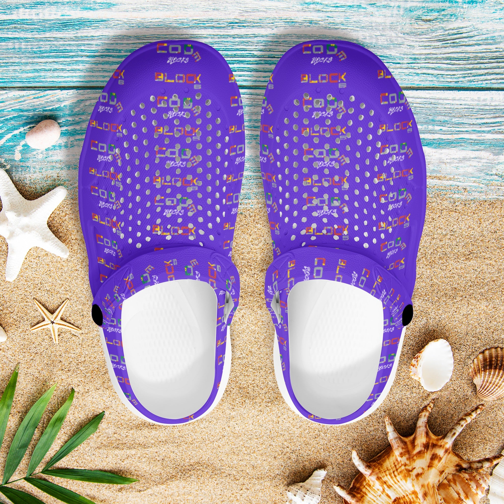* Custom all over printed sandals with vent holes for increased breathability.