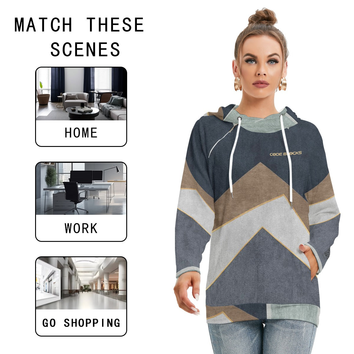 Fashionable double-hat hoodie. The pockets are designed with diagonal pockets, the inner hat is equipped with a hat string, and the outer hat is a regular hat with irregular splicing on the cuffs.