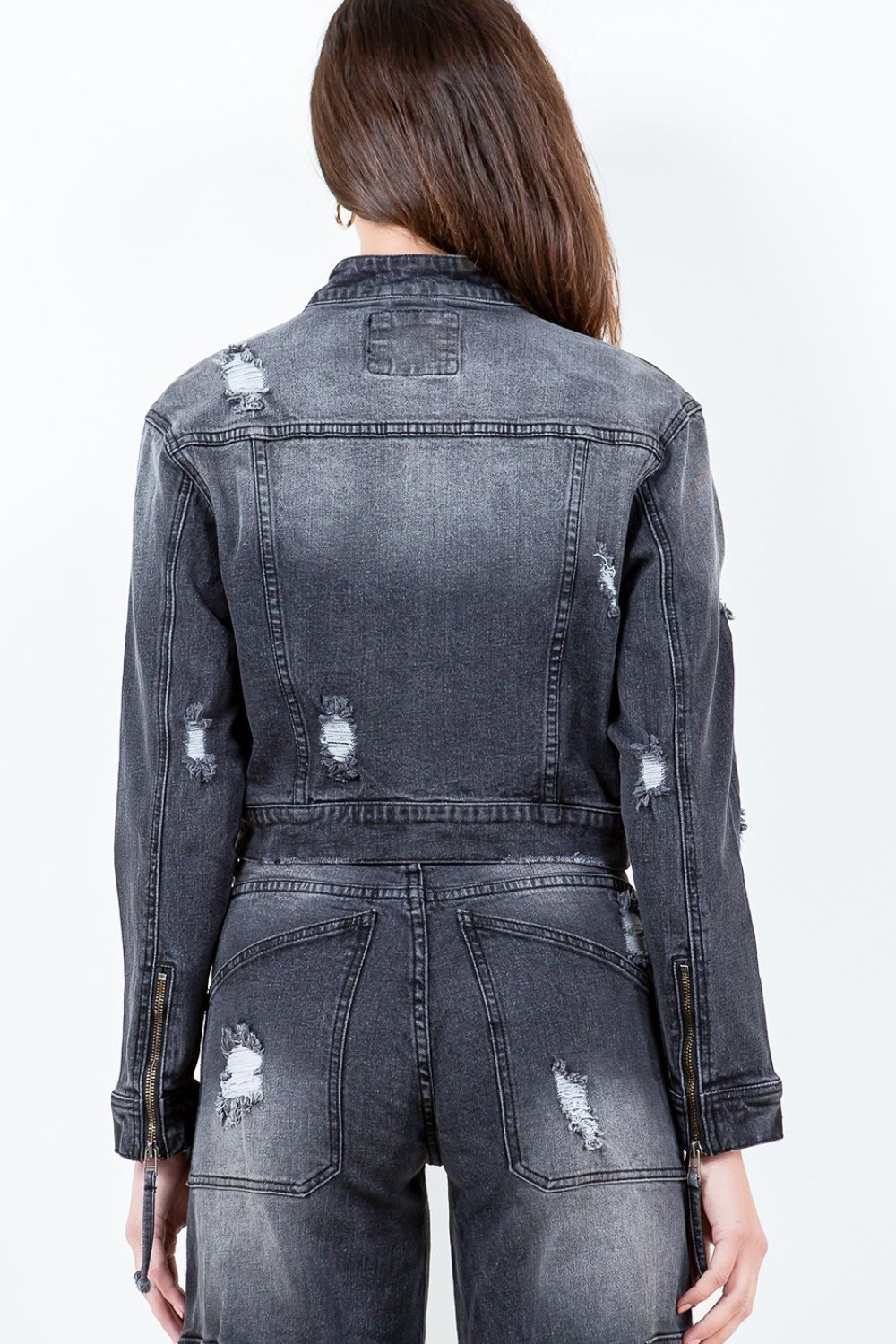 American Bazi Full Size Distressed Star Stud Trim Denim Rider Jacket Plus Size